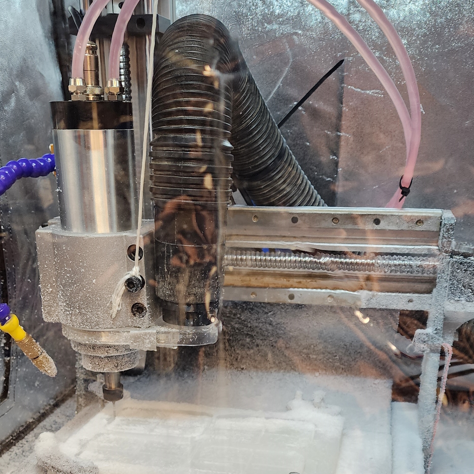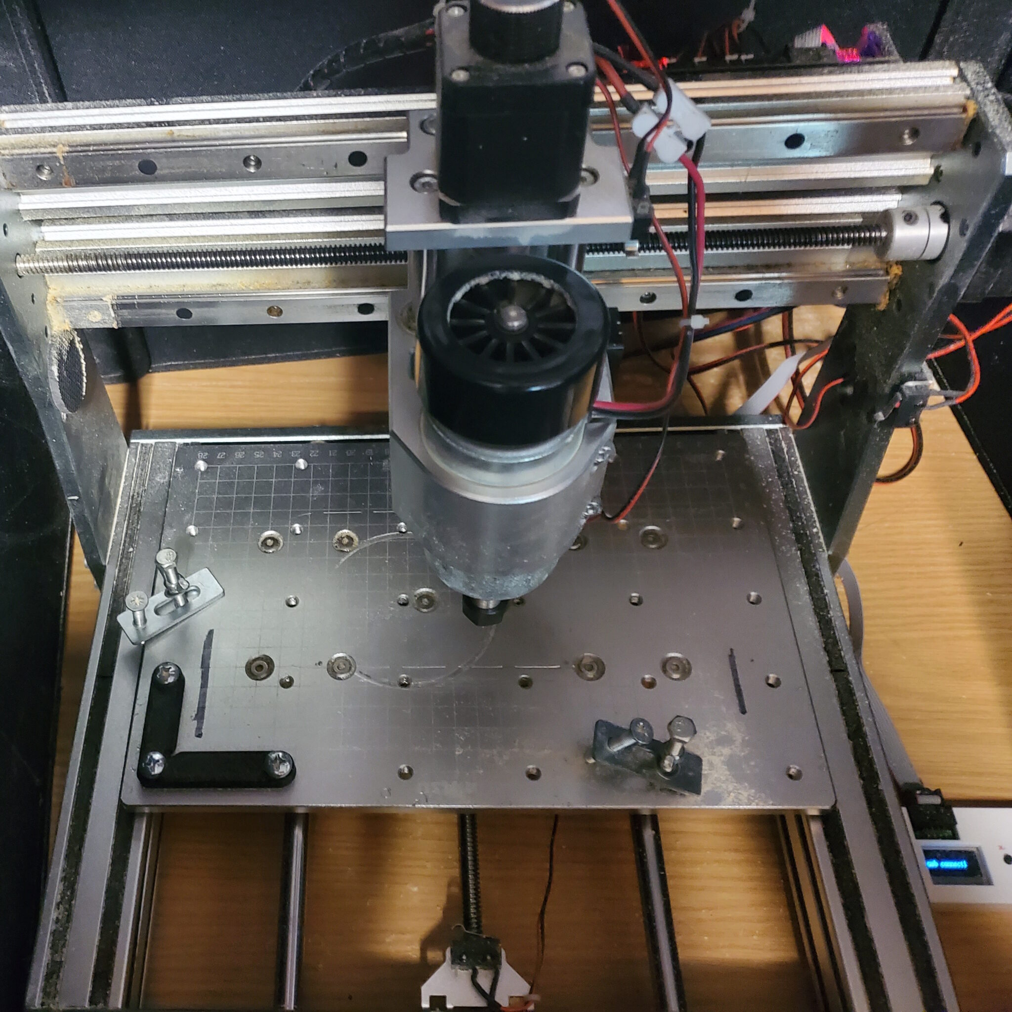 Mounting of the commissioned parts went without issue, with the only additional modifications needed to be made being shifting the work platform of the CNC forward to adjust for the further forward spindle, and align the spindle to be concentric and square with the work bed (known as tramming). As a beginner in CNC a lot was learned by tearing everything down to the individual nuts and bolts of the machine and seeing it all in CAD to understand how each of the parts connect and function. But the assembly gave me some challenges with trying to tram the spindle to the concentricity advertised by the spindle seller, teaching me a lot about how squareness and concentricity matters on the CNC and will translate into errors/artifacts in the workpiece. By making these upgrades I have already found the next bottleneck in making the machine run better. One piece of work that still needs to be incorporated with the current upgrades is connecting and configuration with the CNC controller for programmatic control of the spindle speed. Regardless, with the current upgrades I am able to run the machine with at least 100% higher feed rate or depth of cut and still have a higher quality surface finish than previously.