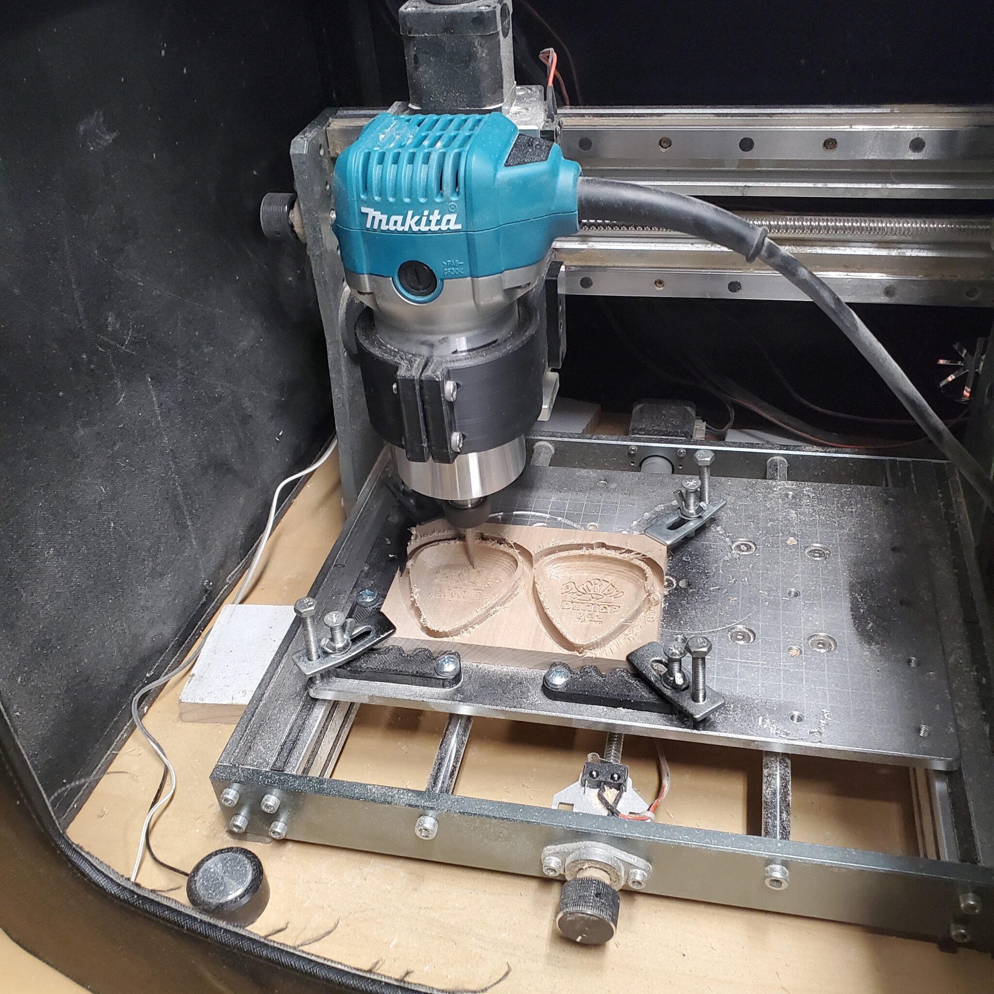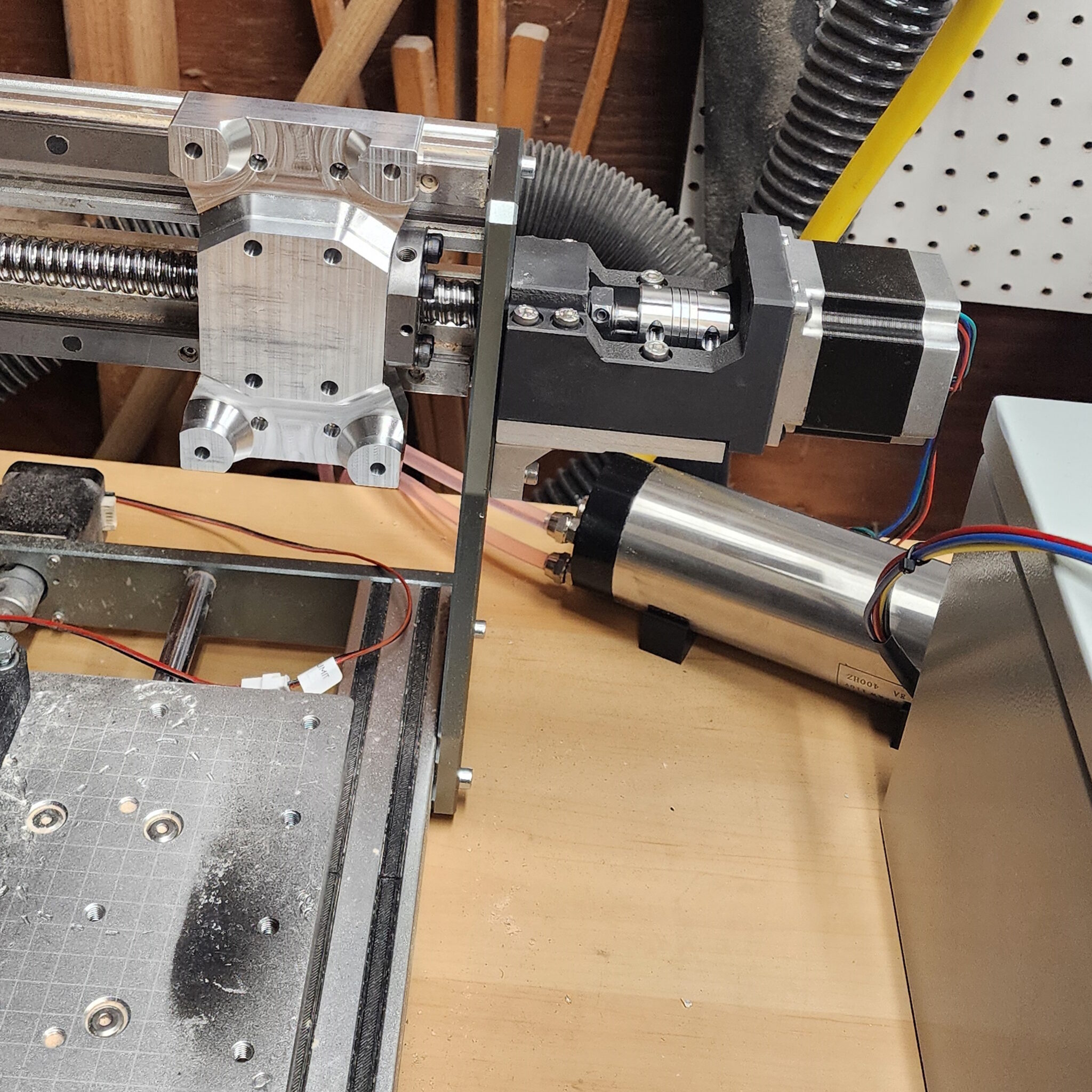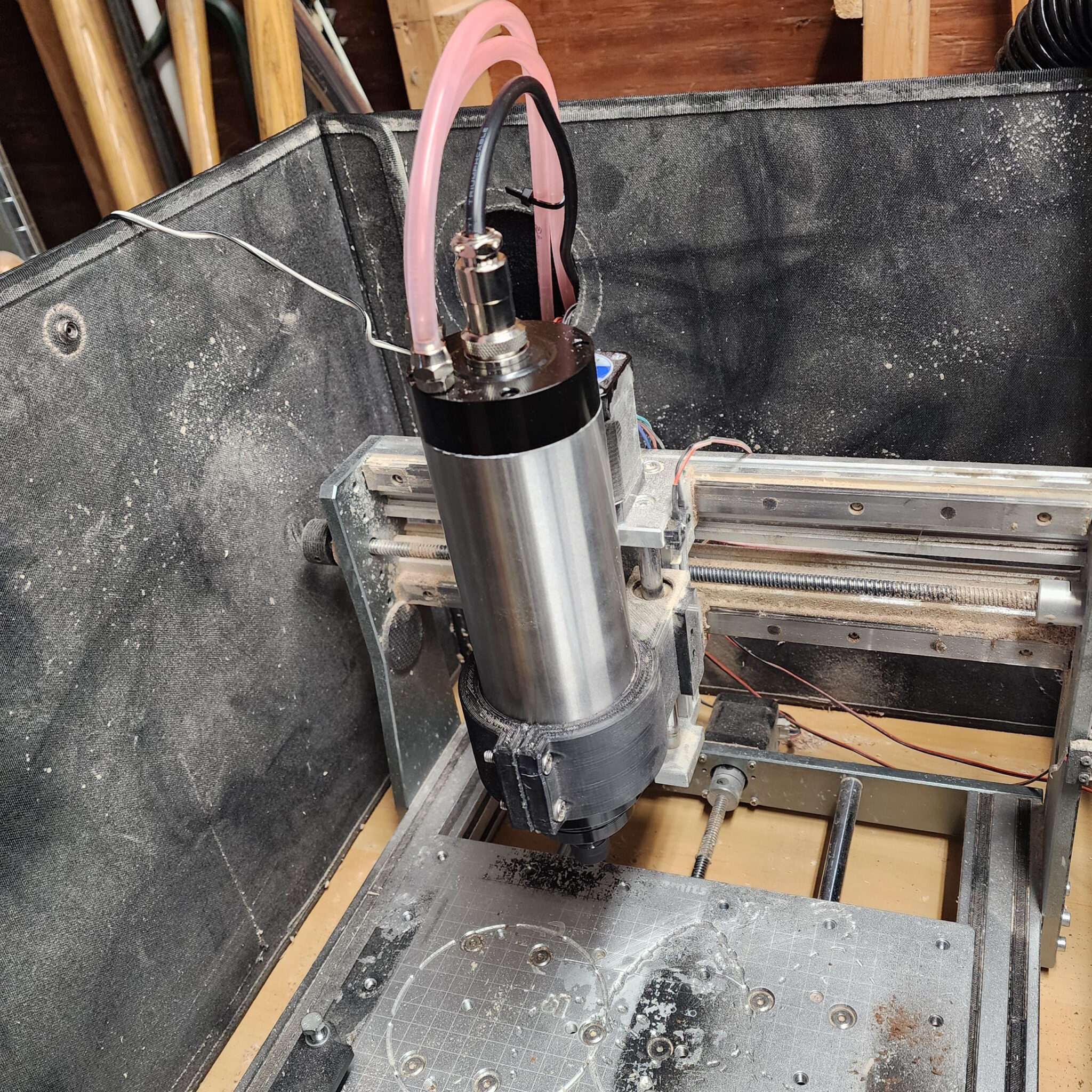 This all came about when my included spindle (300W) died from extended batch use, and I then switched to an 800W Makita RT0701C Router with a 3D printed mount. At the time I was making batches of some small woodworking projects and products and the router was a substantial upgrade over the stock 300w DC motor. This worked okay for a while other than the noise level, and ended up lasting about a year before giving up the ghost. I needed a new option that I could run for an extended period of time with high power and low noise so I opted for a liquid cooled 1.5kW VFD spindle allowing for long and tough operations at steady cool temperatures.