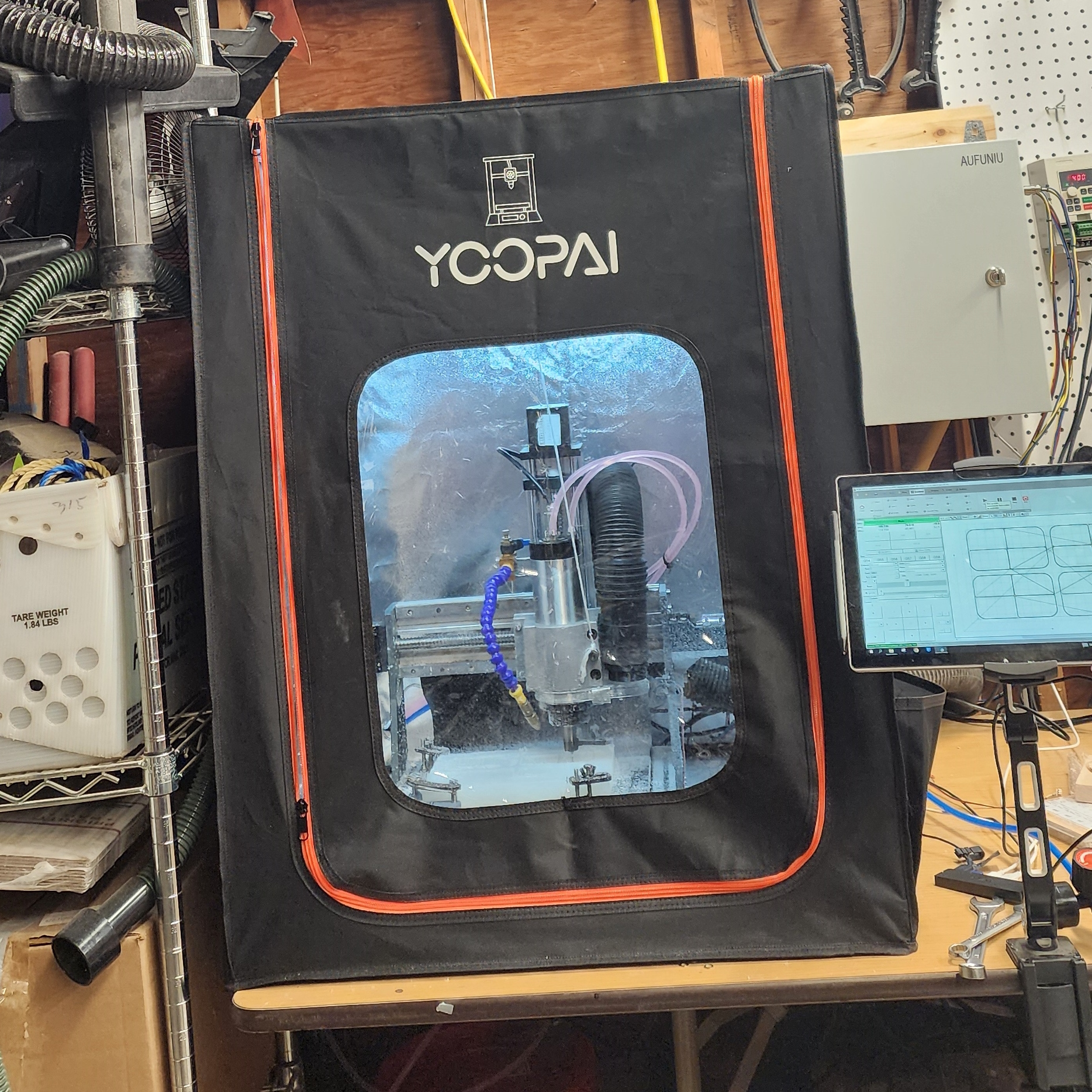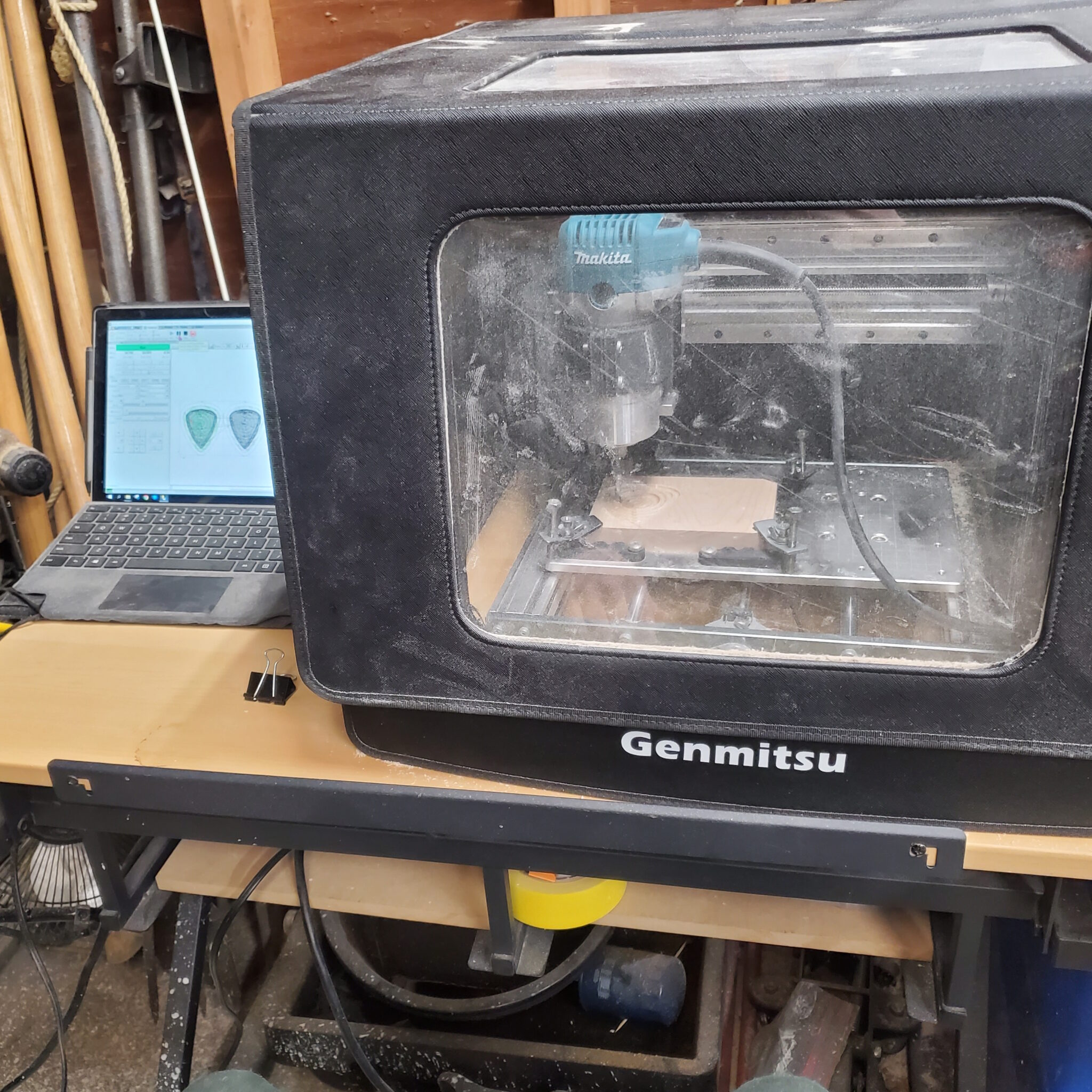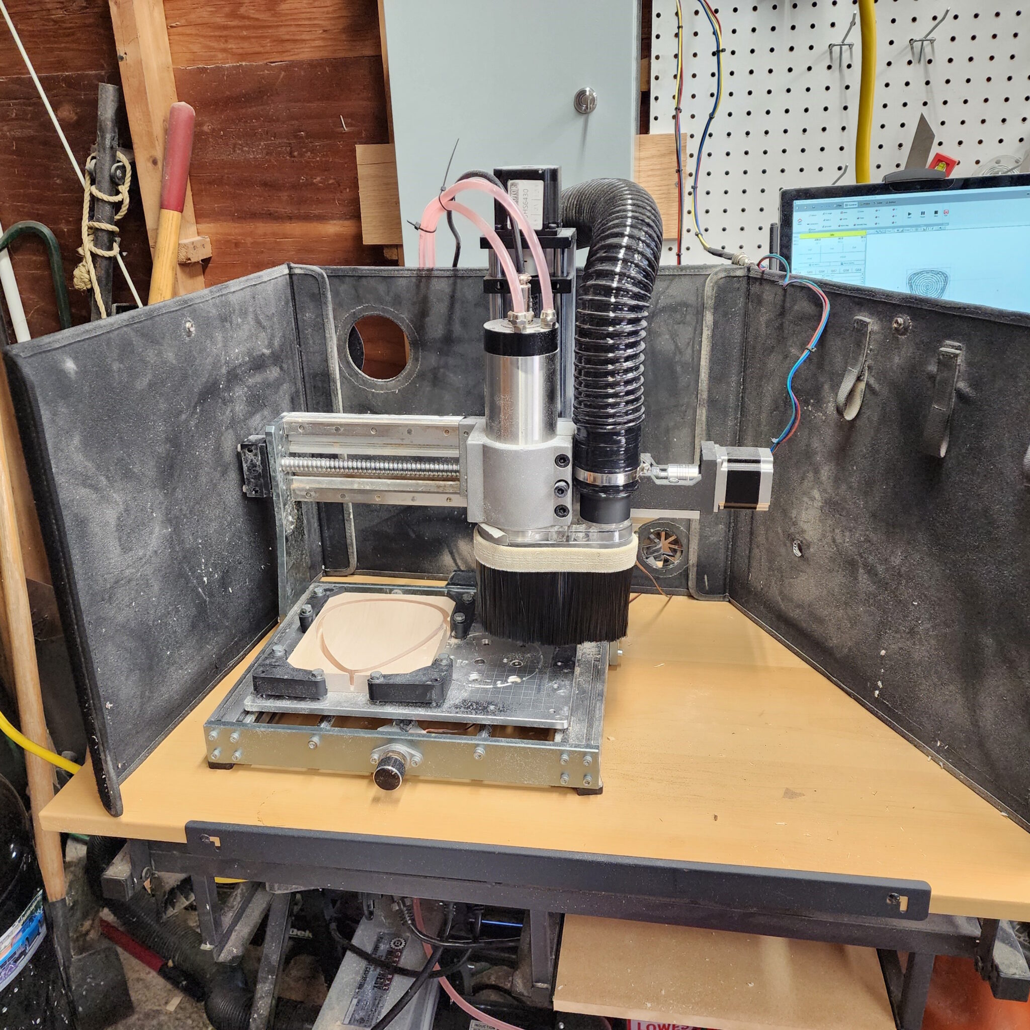 This all came about when my included spindle (300W) died from extended batch use, and I then switched to an 800W Makita RT0701C Router with a 3D printed mount. At the time I was making batches of some small woodworking projects and products and the router was a substantial upgrade over the stock 300w DC motor. This worked okay for a while other than the noise level, and ended up lasting about a year before giving up the ghost. I needed a new option that I could run for an extended period of time with high power and low noise so I opted for a liquid cooled 1.5kW VFD spindle allowing for long and tough operations at steady cool temperatures.