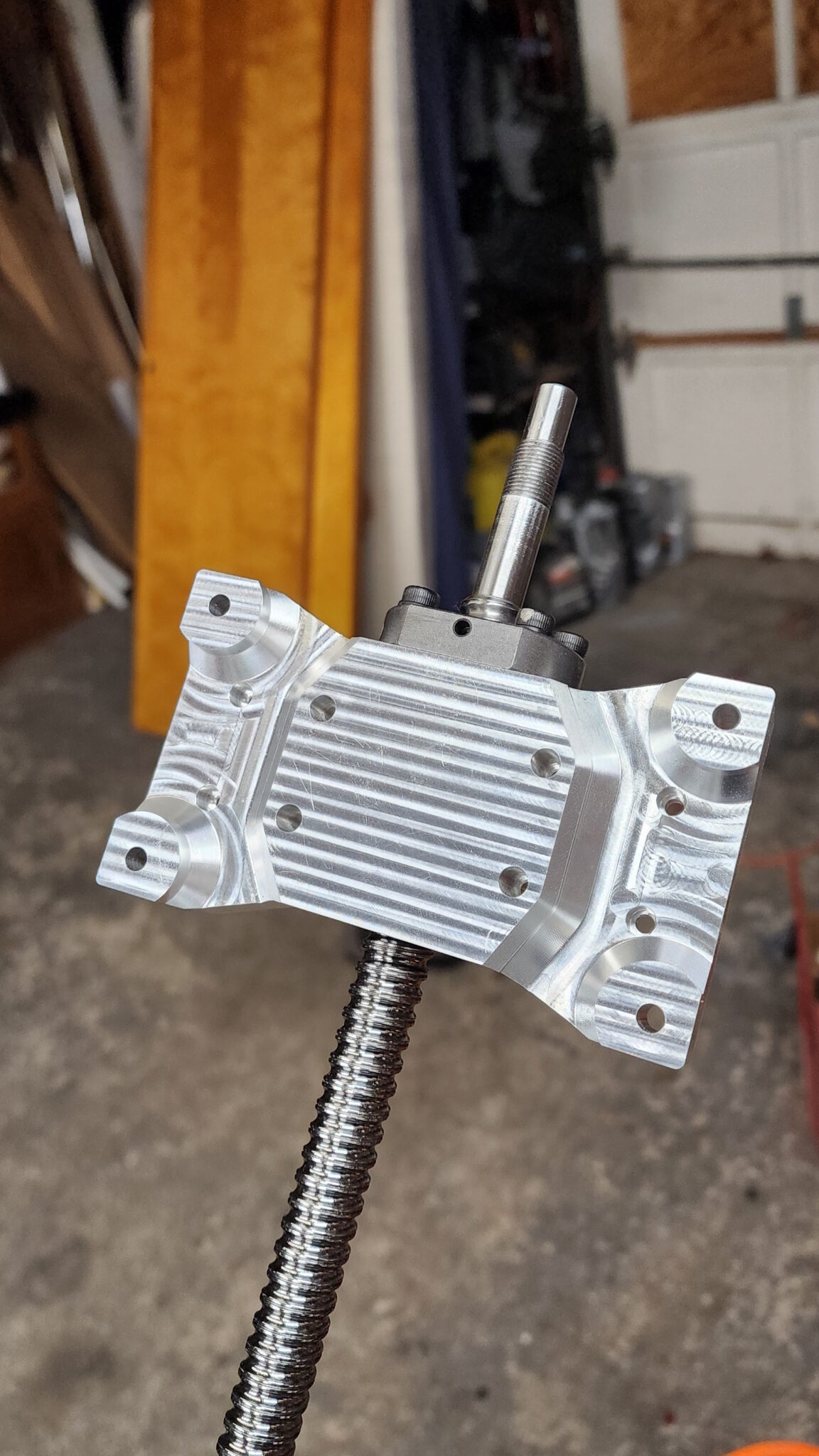 This piece was the heart of the upgrade so the speak. This would tie in all the new upgrades for the X-axis with the new Z-axis to the existing bearings on the frame of the machine. This part was designed to be made of aluminum and featured geometry to remove excess material keeping weight and inertia down while maintaining strength. To manufacture this part a 5-axis CNC would be recommended so the design was contract manufactured by PCBway with their 5-axis capability. The featured geometry of the part include the through bore and mounting pattern for the ball screw nut, the patterns for mounting to the linear bearing blocks on the CNC’s frame, and the pattern for attaching and carrying the Z-axis assembly.
