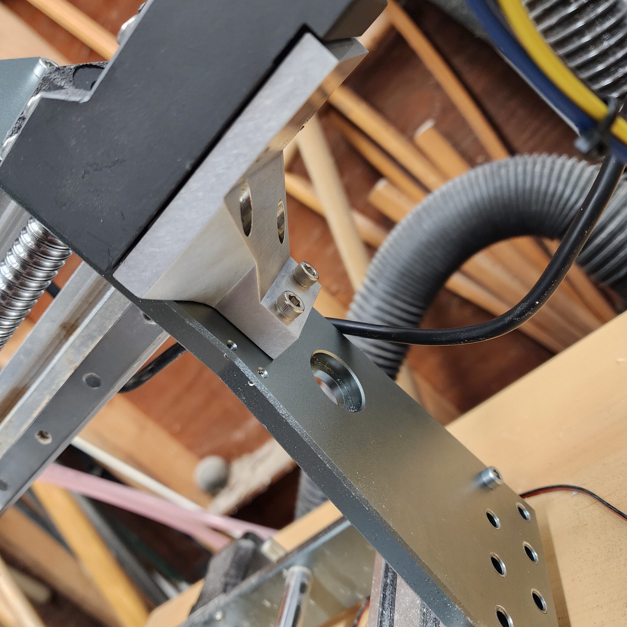 As expected, none of the new parts I specified for the project were able to be drop in replacements for my machine so additional new parts would need to be designed and fabricated along with some drilling and cutting of the original chassis to mount everything together. I had figured that while I have the machine offline for the new spindle, I may as well upgrade the screws and steppers to handle the extra power and remove the backlashing ruining my machines accuracy and performance. Critical to making this work was finding someone had already constructed an accurate CAD model of my stock machine, which allowed me to download and import it for modification with my new parts list. Then as each new piece was added to the CAD design, new components were designed to fit the new parts onto the existing frame and parts to form a more performant CNC machine.